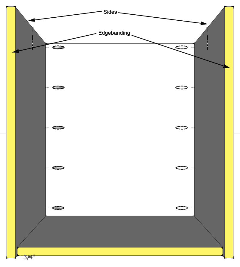 Drill 1 or 2 pocket holes on the inside top middle of each side panel to attach the top later. Apply edgebanding to the front and back of the side pieces. Then screw the sides to the bottom and back using wood glue and 1-1/4" coarse thread Maxi-Loc head pocket hole screws in the holes previously drilled on the back and bottom.